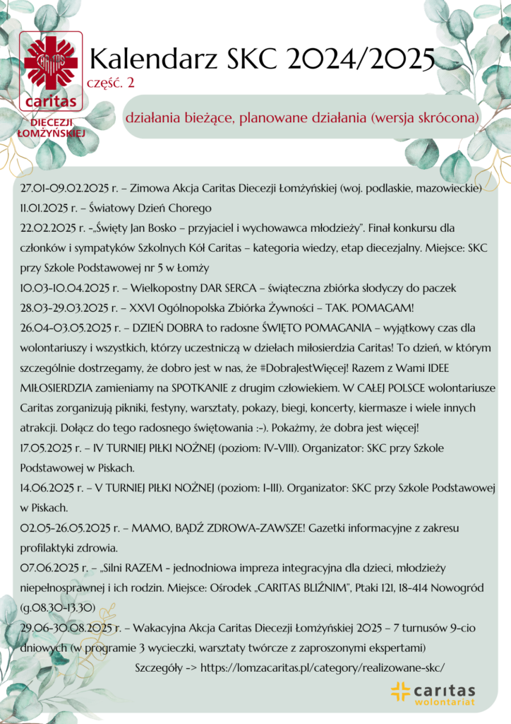 WAKACYJNA AKCJA CARITAS 2024 – rekrutacja uczestników na wypoczynek, 9 dniowe wyjazdowe warsztaty edukacyjno-profilaktyczne; 9 dniowe warsztaty animatora zabaw; nabór kadry wychowawczej i kierowniczej.