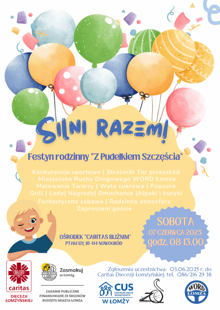 Silni RAZEM – festyn rodzinny z „Pudełkiem szczęścia” Opublikowano 05/05/202516/09/2025 przez Katarzyna Szklarz ZAPRASZAMY! Nie może Ciebie zabraknąć!