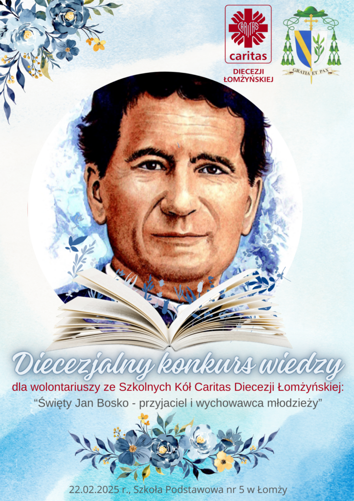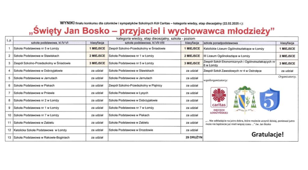 „W sobotę, 22 lutego Szkoła Podstawowa Nr 5 w Łomży wraz z Caritas Diecezji Łomżyńskiej współzorganizowała Diecezjalny Konkurs Wiedzy „Święty Jan Bosko – przyjaciel i wychowawca młodzieży”. Wzięło w nim udział 29 szkół z diecezji łomżyńskiej. Konkurs podzielony był na 3 kategorie: klasy IV-VI, klasy VII-VIII oraz szkoły ponadpodstawowe. Wszystkich uczestników i gości powitała pani dyrektor Małgorzata Pietrusewicz oraz ksiądz dyrektor Andrzej Mikucki. Otuchy zawodnikom dodały uczennice naszej szkoły, które przepięknie zaśpiewały piosenki o św. Janie Bosko. Po zakończeniu eliminacji w kościele pw. Św. Brunona z Kwerfurtu została odprawiona uroczysta msza święta, po której wręczono uczestnikom nagrody i dyplomy.