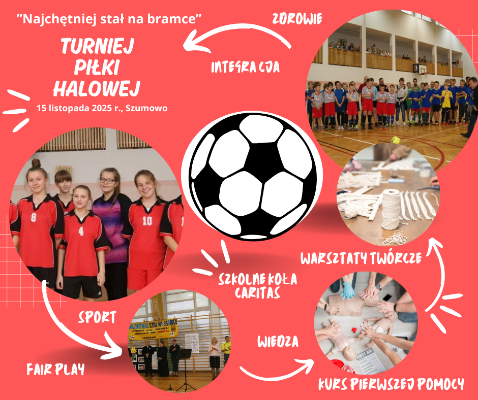 TURNIEJ PIŁKI HALOWEJ W SZUMOWIE Opublikowano 08/10/202508/10/2025 przez Katarzyna Szklarz Zapraszamy członków i sympatyków Szkolnych Kół Caritas do udziału w turnieju! Zarezerwuj swój czas 15 listopada 2025 r. Do pobrania: Regulamin piłki halowej Karta zgłoszenia