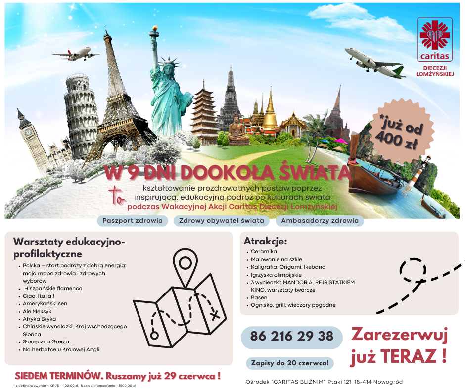 Wypoczynek organizowany w 2025 roku przez Caritas Diecezji Łomżyńskiej po raz kolejny stworzy możliwość do odkrywania świata i rozwijania pasji naukowych w ramach promocji i profilaktyki zdrowotnej z elementami problematyki uzależnień. Kształtowanie prozdrowotnych postaw poprzez inspirującą, edukacyjną podróż po kulturach świata w oparciu o autorski program: „W 9 dni dookoła świata”. Program przewiduje: zwiększenie świadomości zdrowotnej uczestników poprzez połączenie nauki o zdrowiu z ciekawostkami o różnych regionach świata, promowanie zdrowego stylu życia w tym aktywności fizycznej, zdrowego odżywiania, higieny psychicznej i unikania nałogów – w atrakcyjnej, angażującej formie, łączenie profilaktyki z podróżniczym odkrywaniem – każdy „dzień” programu to symboliczna wizyta w innym kraju/kulturze, co pozwala na prezentowanie różnych podejść do zdrowia i stylu życia na świecie, rozbudzanie ciekawości świata i postaw otwartości kulturowej, co pozytywnie wpływa na zdrowie psychiczne, integrację społeczną i ogólny dobrostan. W trakcie kreatywnych „podróży” edukacyjnych po kulturach świata uczestnicy będą uczyć się, jak dbać o zdrowie fizyczne i psychiczne, poznając jednocześnie różnorodność kulturową i zwyczaje zdrowotne w różnych regionach świata.