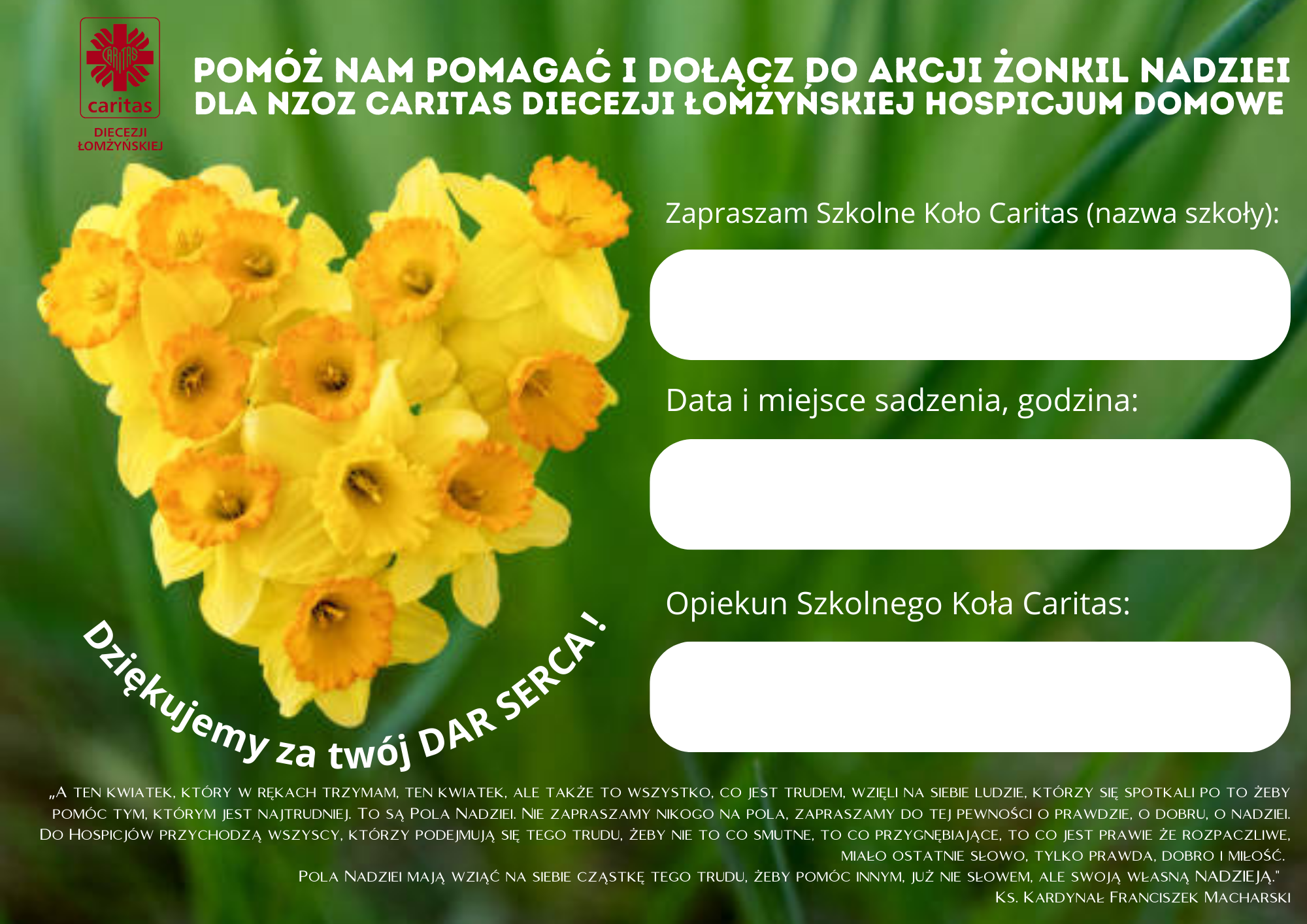 Najpierw wolontariusze w okresie jesiennym sadzą cebulki żonkili, aby wiosną kiedy zakwitną ściąć na potrzeby kwesty w parafiach, celem której jest wsparcie działalności statutowej Caritas Diecezji Łomżyńskiej – NZOZ Caritas Diecezji Łomżyńskiej HOSPICJUM DOMOWE. Patronat honorowy nad kwestą pełni J. E. Ks. Bp Janusz Stepnowski.
