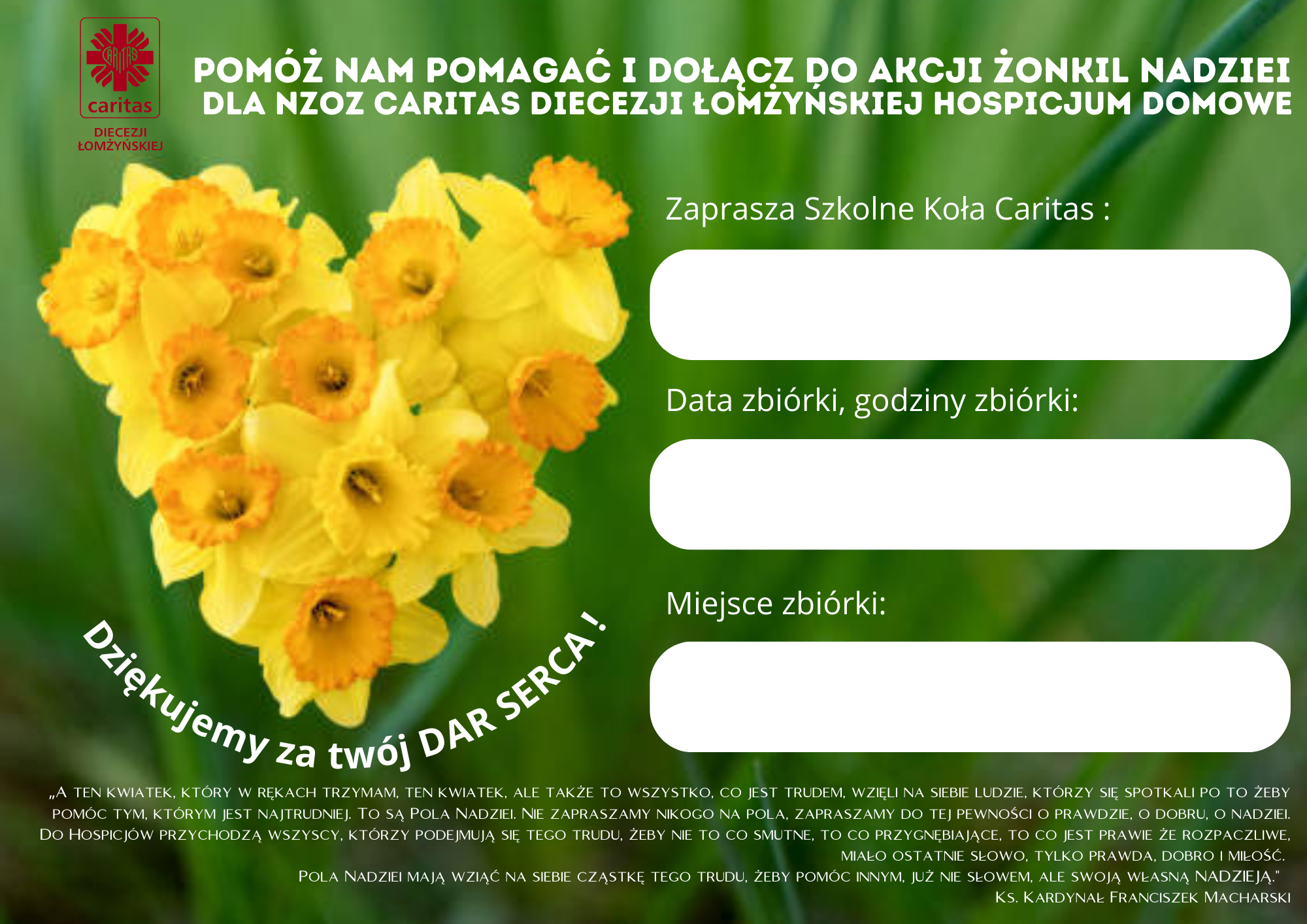 Serdecznie zapraszamy do uczestnictwa do udziału w: Akcji charytatywnej – Żonkil Nadziei w ramach wolontariatu Szkolnych Kół Caritas
